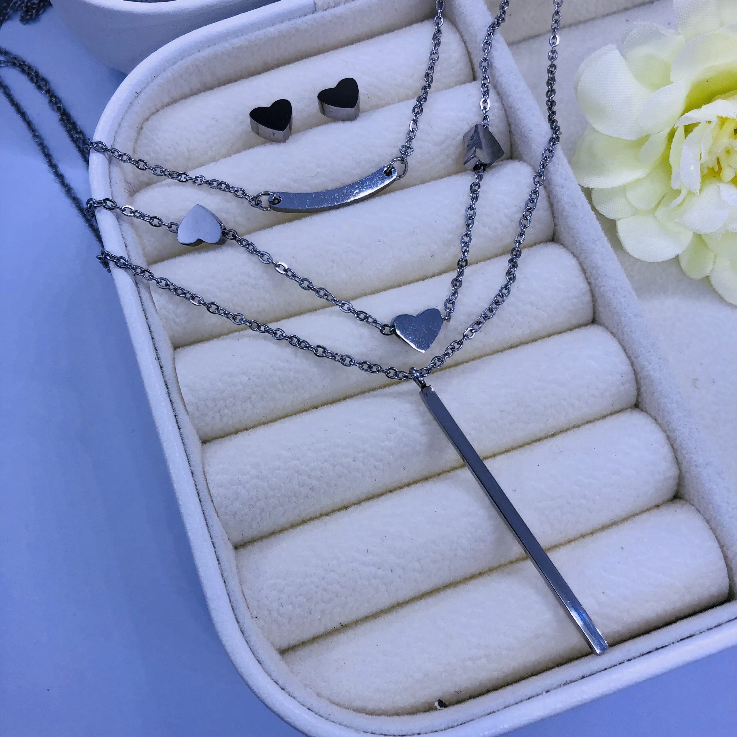 Set en acero color plateado que incluye un collar triple con dijes de corazones y barra vertical, acompañado de aretes pequeños en forma de corazón. Un diseño moderno y elegante, ideal para complementar cualquier look. Fabricado con acero de alta calidad, resistente, liviano y antialérgico.