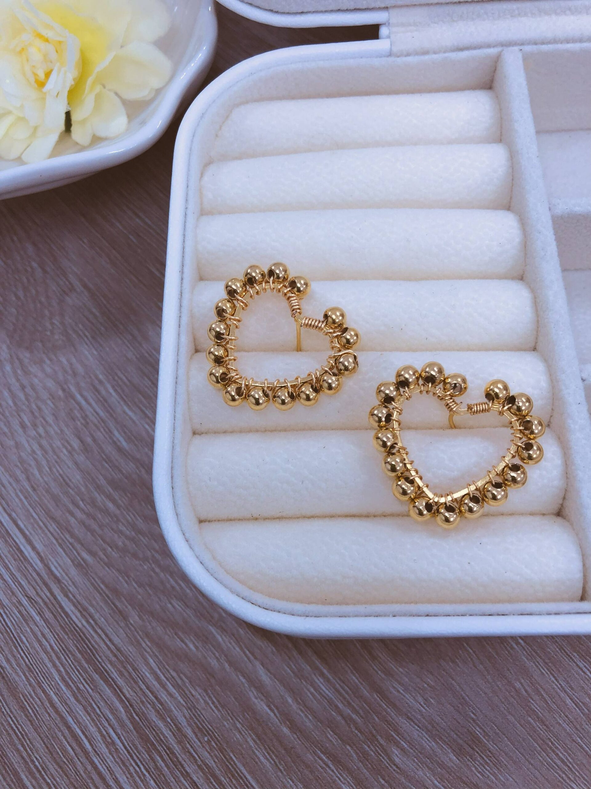 Un detalle tierno con un brillo sutil: estos topos en forma de corazón, tejidos en balines, aportan ese toque especial que realza tu estilo sin exagerar.